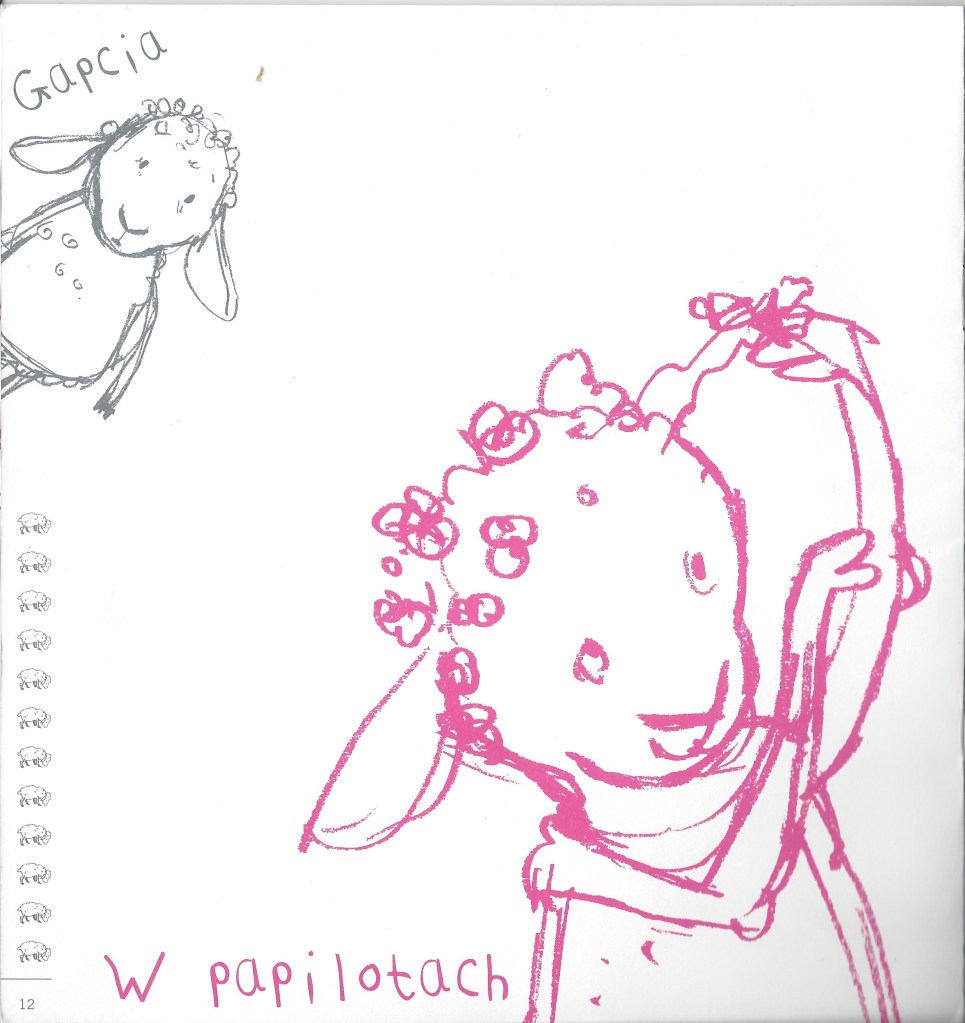 Najmłodsza wieczorem mleka właściwie nie pije, ale bardzo lubi wyliczanie owieczek, które chowają się w tej książeczce. Stało się to naszym kolejnym wieczornym rytuałem. Kiedyś co wieczór wspólnie z zajączkami wyznawałyśmy sobie miłość, a teraz wyliczamy owieczki. Jakie ? Och, najrozmaitsze… Jest psotna, jest leniuszka, piegowata, kudłata, jest też taka w papilotach i (najtrudniejsza 😉 ) prze-inte-lek-tua-li-zo-wa-na. Jest jeszcze wiele innych, a wszystkie narysowane przez Joannę Olech. Narysowane tak pomysłowo, że każda ma jakąś cechę charakterystyczną i Najmłodsza bardzo szybko nauczyła się je odróżniać.