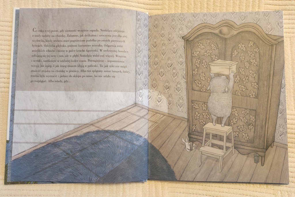 Napisałam, że „Świąteczny kalendarz Gabrysi” był moim największym tegorocznym zaskoczeniem, ponieważ jakoś podświadomie nie spodziewałam się, że ta książka może zawierać w sobie tak głęboką historię. Myślę, że problemem była okładka, bo bardzo nie lubię tego koloru, gryzie mi się z czerwienią sukienki i ozdób choinkowych 😉 W ogóle ilustracje trochę mnie rozczarowały. Bardzo ładne są choinkowo – pierniczkowe winietki zaczynające każdy dzień, ale nie do końca trafia do mnie kreska, jaką rysowane są tutaj postacie ludzkie i ich twarze. Jednak nie zawsze, bo na przykład cała rodzina przy wigilijnym stole podoba mi się bardzo.