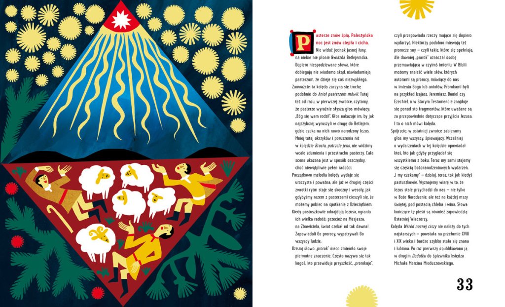 Tę część Maria Strzelecka zilustrowała drzeworytami, do których wykorzystała deski ze starych beskidzkich drzew. Miałam przyjemność mieć w ręku te klocki i widziałam, jak powstają odbitki. Nie zdawałam sobie sprawy jak trudna i żmudna jest to technika i ile czasu potrzebne jest na zrobienie jednej ilustracji. Do każdego koloru powstaje oddzielna matryca, a na niej w lustrzanym odbiciu wyrzeźbione jest tylko to, co na ilustracji ma być w tym kolorze. Poszczególne matryce muszą być idealnie spasowane – i na etapie rycia, i na etapie odbijania, żeby się na ilustracji kolory nie rozjechały. Po odbiciu jednego koloru odbitka musi dokładnie wyschnąć, żeby się nic nie rozmazało, więc zrobienie kolorowej ilustracji wymaga kilku dni.
